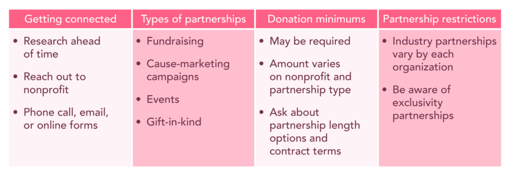 Organizations offer different types of partnerships, and finding the right one for your company is important. Types of partnerships can include fundraising, cause-marketing campaigns, events, and gift-in-kind.